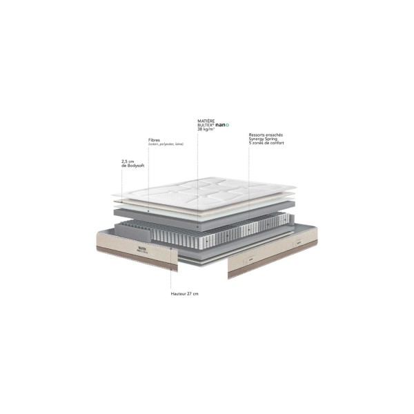 non 805 ressorts ensachés + mousse nano 5cm dens.38k/m3 88% polyester +12% viscose Oekotex